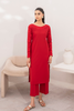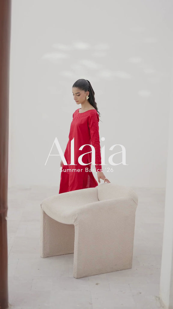 A bold red medium-length shirt featuring monochromatic embroidered neckline and sleeves. Paired with simple culottes that are versatile in your entire wardrobe. Made for the fun and powerful girl.