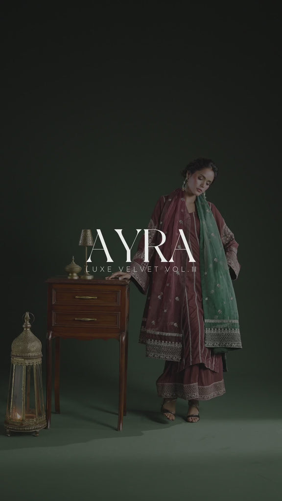 A dark taupe velvet ensemble, adorned with delicate embroidery, carrying charm and subtle elegance, paired with embroidered culotte pants and an ombre embroidered organza dupatta that completes the look with effortless grace.