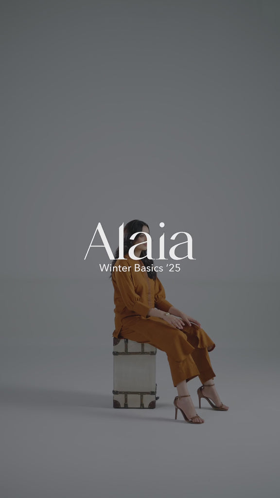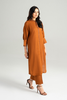 In a rich amber hue, Alma captures quiet luxury. Subtle embroidery trails the front placket while pleated sleeves end in tailored cuffs with covered buttons. Coordinating trousers complete this refined, monochrome ensemble — perfect for those who favor elegance in simplicity.