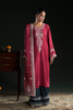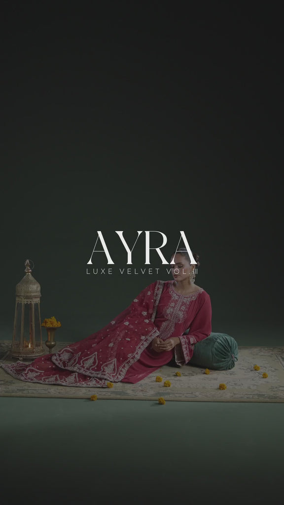 An exquisitely embroidered velvet ensemble with delicate textures and intricate details, radiating quiet charisma and effortless charm, paired beautifully with wide-leg velvet pants and an embroidered organza dupatta that completes the look with graceful elegance.