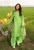 A lively green shirt, intricately embroidered with ornate patterns that captivate at first glance, paired beautifully with printed trousers that provide quiet balance, and finished with a flowing printed silk dupatta that brings a soft, luminous touch — a look that radiates charm, character, and effortless allure.