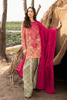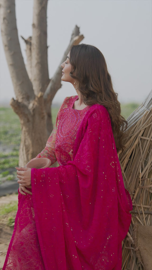 A colorful printed shirt with bold fuchsia embroidery at the front, paired with coordinating farshi shalwar, and completed with a flowing fuchsia dupatta adorned with matching embroidered accents — a harmonious blend of patterns and threads, lively yet refined.