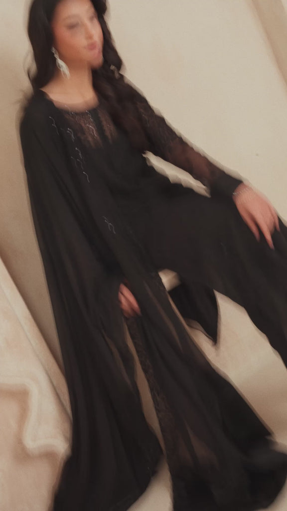 An elegant black chiffon ensemble adorned with intricate thread embroidery and delicate sequin accents. The fluid silhouette and sheer embroidered sleeves create a graceful, elongated look, while the subtle shimmer adds depth and sophistication. Paired with cropped culottes and an embroidered chiffon dupatta.