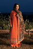 A warm rust-toned embroidered shirt adorned with delicate motifs and intricate detailing throughout, paired with matching trousers for a seamless finish. The printed silk dupatta adds depth through its striking pattern and fluid drape, enriching the ensemble with character, color, and quiet allure.